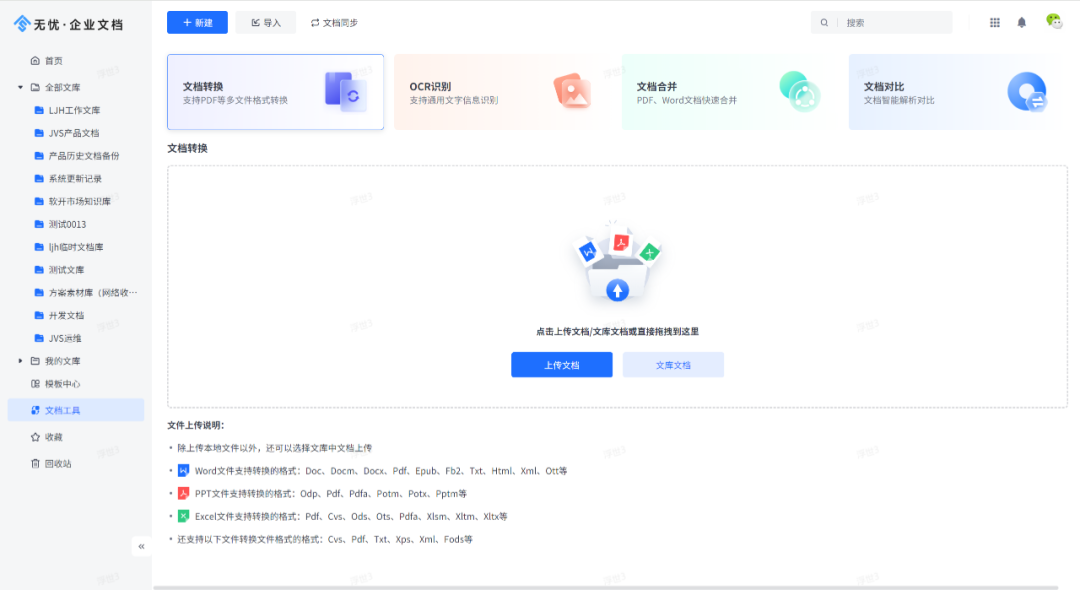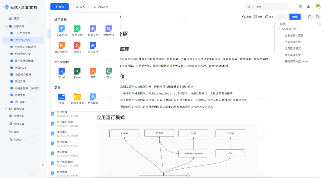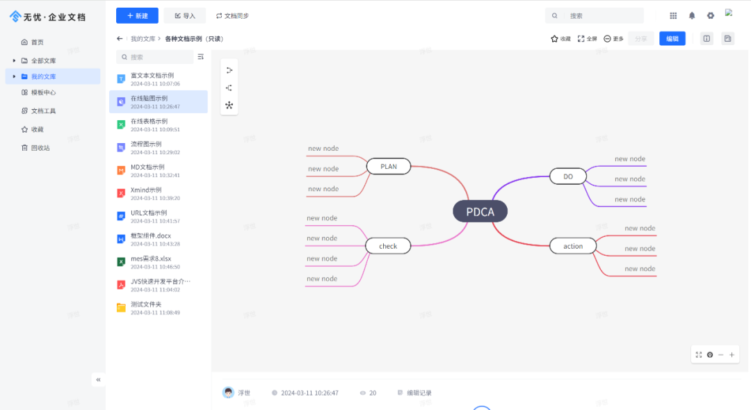 支持多种文档类型在线创建与编辑,包括类Word富文本、类XMind思维导图、类Visio流程图等。提供完整的文档增删改查及分享设置功能,满足灵活、高效的文档处理与协作需求。