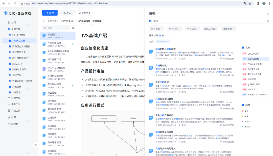 企业级搜索引擎,可按标题或全文进行检索;支持文档评论、收藏、分享(可设密码保护)及模板复用。在权限管理方面,结合组织与群组,实现细颗粒度的企业级权限控制。