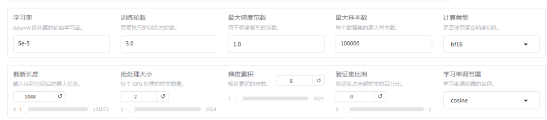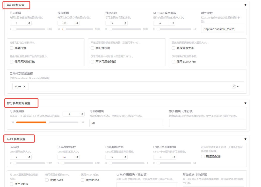 - 实验监控:LlamaBoard、TensorBoard、Wandb、MLflow、SwanLab 等等。