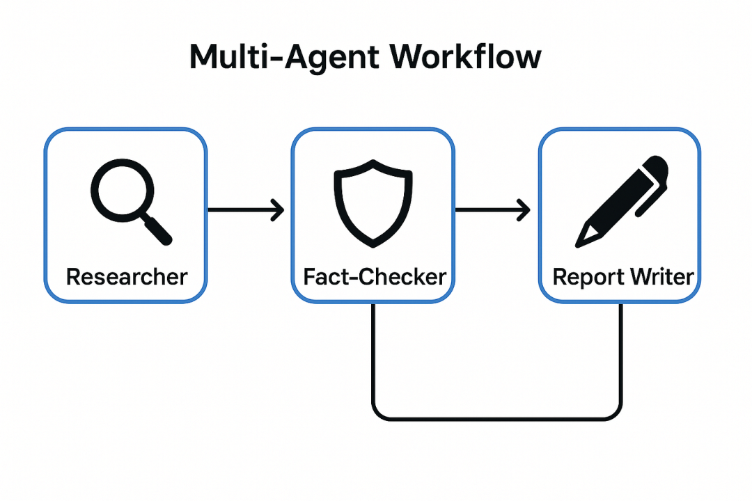 该设计实现了智能体间的有序交接,研究员负责信息收集,事实核查员进行验证筛选,报告生成员完成最终输出。每个智能体明确了解自己的工作时机和输入来源。