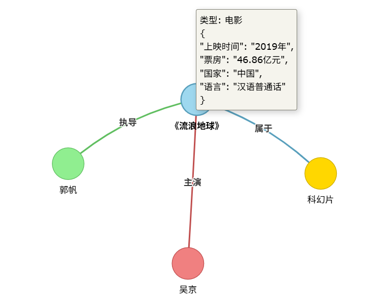 - 节点(实体): - 节点 1:《流浪地球》(实体类型:电影) - 节点 2:郭帆(实体类型:导演) - 节点 3:吴京(实体类型:演员) - 节点 4:科幻片(实体类型:电影类型)- 边(关系): - 节点 2 → 节点 1:边标签为 “执导”(表示郭帆执导了《流浪地球》) - 节点 3 → 节点 1:边标签为 “主演”(表示吴京主演了《流浪地球》) - 节点 1 → 节点 4:边标签为 “属于”(表示《流浪地球》属于科幻片类型)- 属性: - 节点 1 的属性:上映时间 = 2019 年,票房 = 46.86 亿元(提供电影的额外信息) - 边 “执导” 的属性:合作次数 = 2(表示郭帆与《流浪地球》制作团队的合作次数)