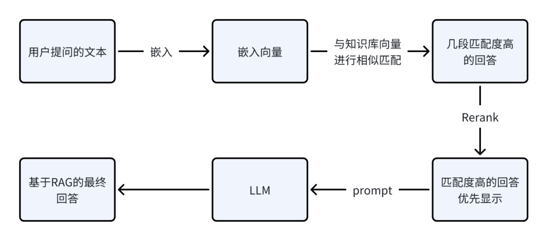 最终找到几段匹配度(如余弦相似度)高的回答,再利用Rerank模型,匹配度高的答案优先选择,结合指导大模型回答的提示词(prompt,可以为指导大模型回复的语气),最终,大模型回答给用户基于知识库检索的答案。