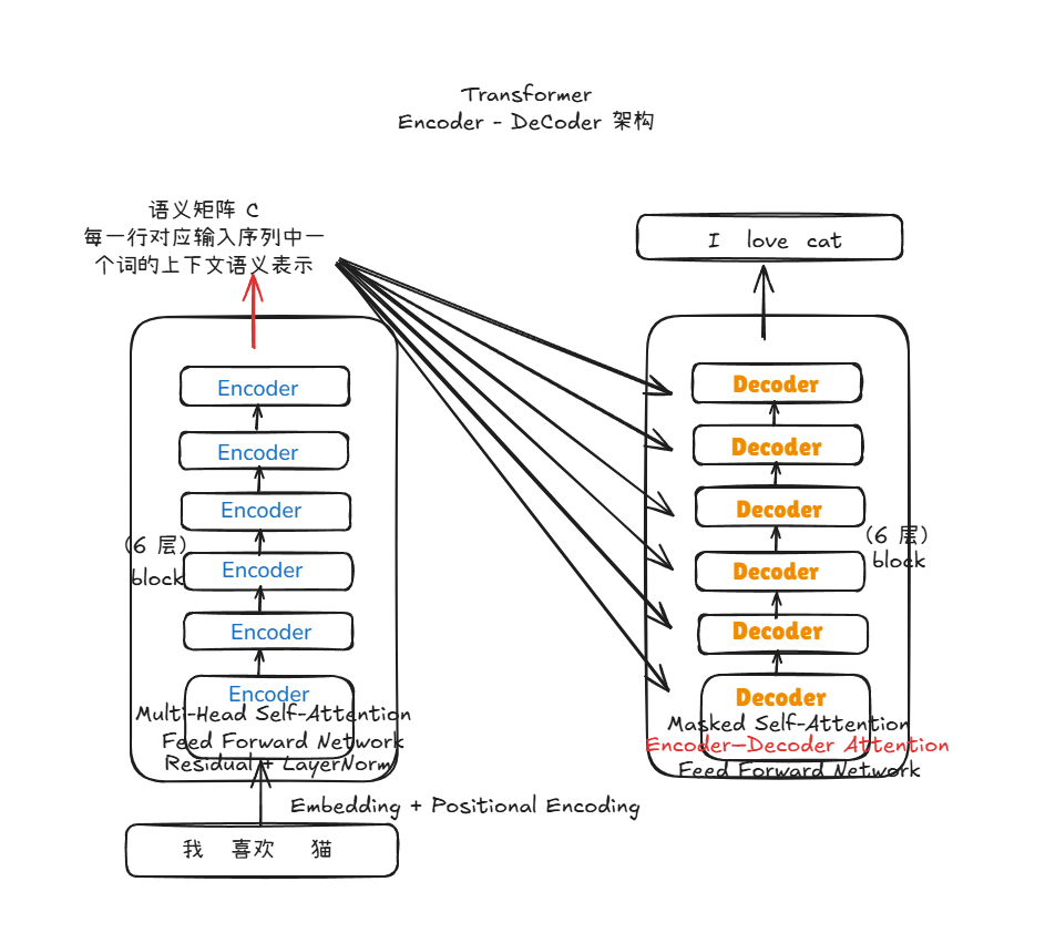 Transformer 是一种完全基于注意力机制的 Encoder–Decoder 架构。虽然它的结构和 Seq2Seq 表面相似(也是编码器 + 解码器),但内部完全不同。