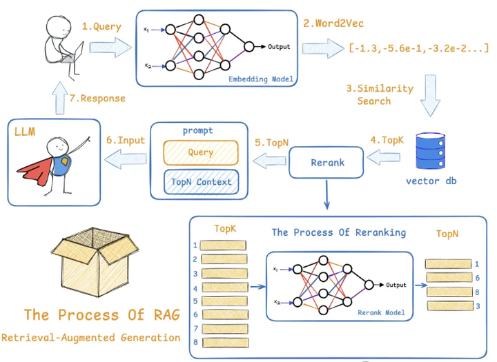 - 检索阶段:将用户的问题转化为向量,从外部知识库或私有文档中(向量数据库)快速检索相关片段。