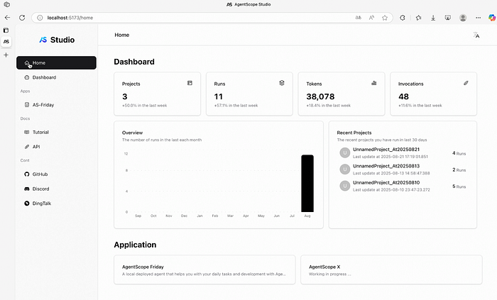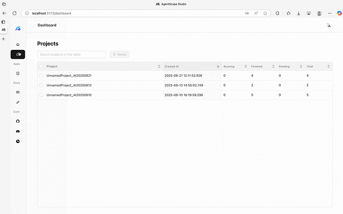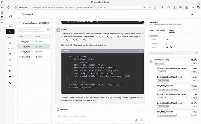 这将打开AgentScope Studio,你可以在其中追踪和可视化你的智能体流程。这使得调试不那么痛苦。