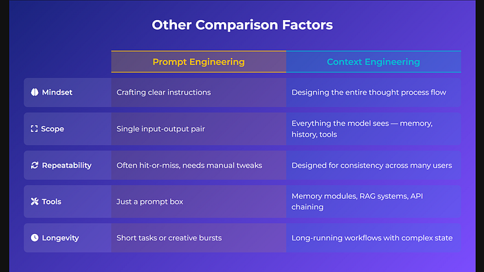 - 可重复性: 提示工程可能时好时坏,通常需要手动调整;上下文工程旨在实现跨多个用户和任务的一致性和重用。