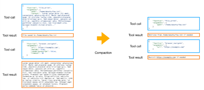 - 精简版:仅保留完整结果的引用(如文件路径“/home/ubuntu/foo.txt”),直接放入上下文窗口。