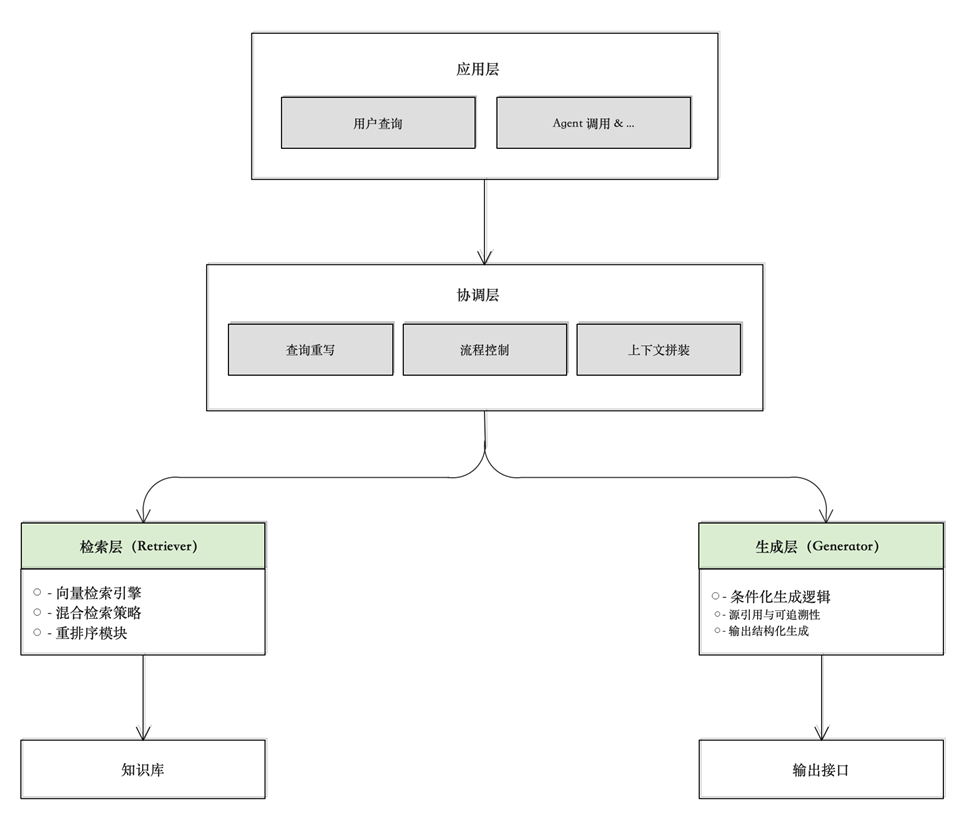 整体可以划分为应用层、协调层、检索层和生成层四个核心部分,每一层既独立自治,又通过明确的接口协议保持上下文的连贯性。