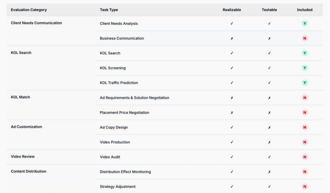 另一个例子是红杉的X-Bench,这个测评的目标是好的:招聘和达人营销领域的实际任务。但从实际落地的角度,其测评内容还是在行业背景下的搜索子任务,而不是端到端的解决问题,相当于行业中的Junior/实习生面对的任务。更致命的是,其中的众多子任务都只列了概念,而实际上“无法测评”。