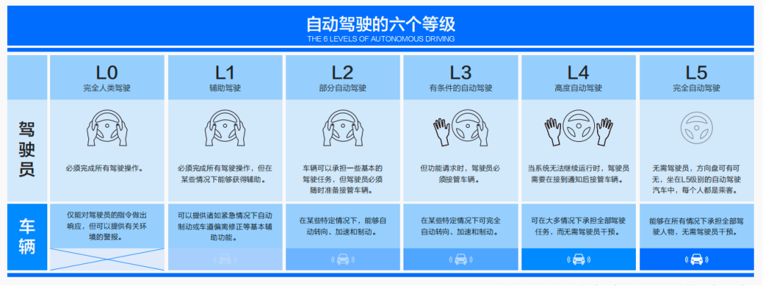 在这一点上,一个可直接参考的对象就是自动驾驶的分级体系。在自动驾驶分级中,主要依据“人类责任逐步减轻”原则,按照驾驶员与车辆在不同阶段所承担的责任范围来界定能力边界。这种分级方式既考虑了技术能力的迭代升级,也兼顾了人与机器的协作关系。