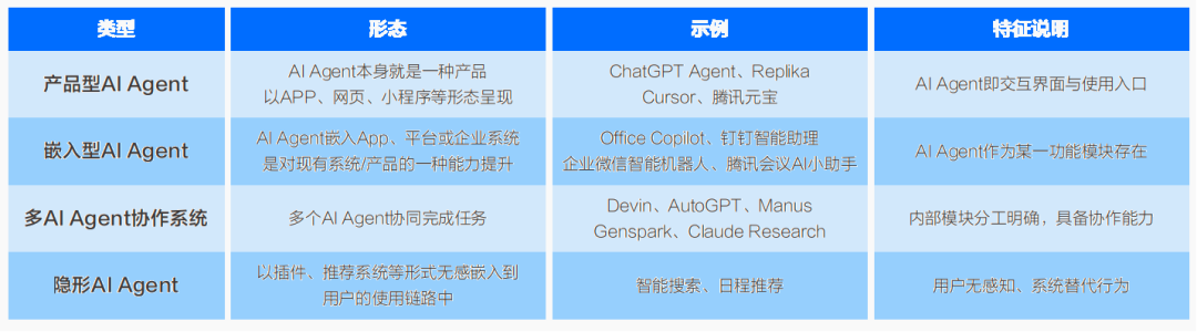 在AI Agent能力发生变化的同时,AI Agent的类型也会不断变化: