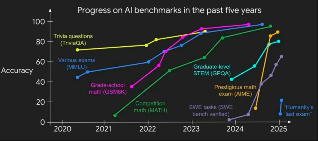 图:在“考试”的测试形式下,AI的刷榜速度越来越快