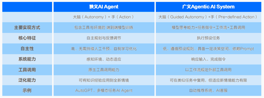 其核心是模型本身具备原生工具调用与任务闭环执行能力。广义智能体系统(Agentic AI System)则更具包容性,泛指一切能够感知环境、决策并执行任务以达成目标的系统。