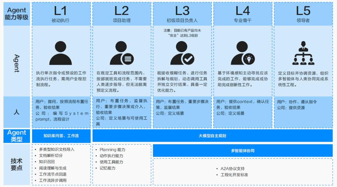 - 从L2起,智能体能力进入狭义AI Agent的范畴,规划能力、协同能力以及自主使用工具的能力成为关键;