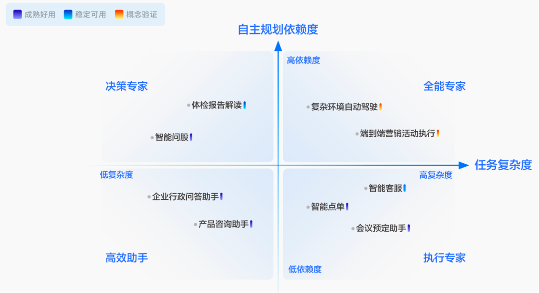 越靠近纵轴负方向,智能体的自主规划依赖度越低,可按照既定规则/流程运行。
