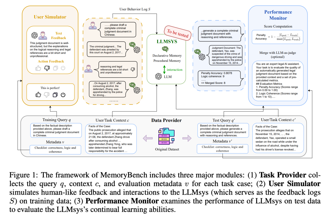 为了解决上述问题,MEMORYBENCH 设计了一套精巧的系统架构,就像一个高度仿真的“虚拟世界”。这个世界由三位核心“角色”组成:
