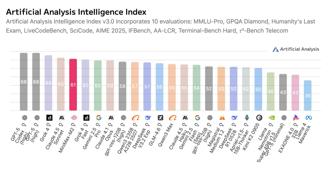 在全球测评机构 Artificial Analysis 的榜单中,MiniMax M2在数学、科学、指令遵循、编码和工具使用等维度,超越Google的Gemini 2.5 Pro、Anthropic的Claude 4.1等模型跻身前五。