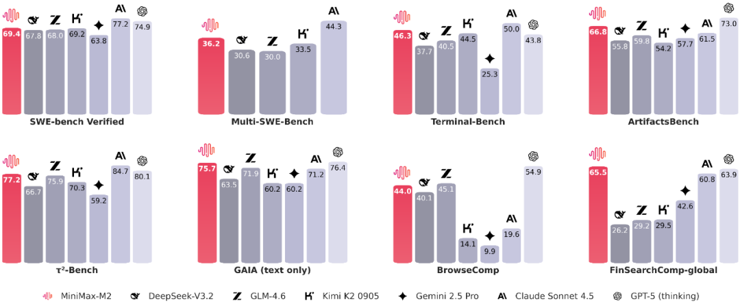 并且在Agent最重要的三个能力,编程、使用工具和深度搜索的能力上,M2的成绩也名列前茅。