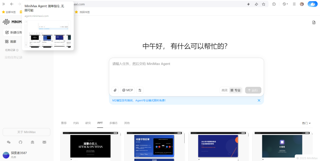 现在MiniMax-M2的通用Agent产品MiniMax Agent现已全面开放使用(网址:https://agent.minimaxi.com/),并限时免费,大家感兴趣的话可以去跑跑体验下。