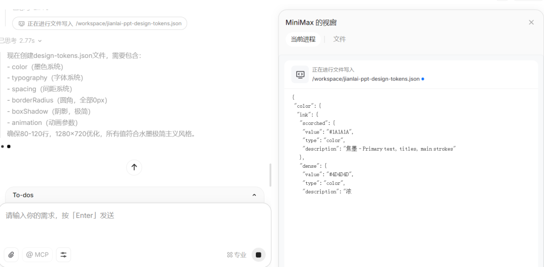 - 从发布这个要求开始,MiniMaxM2就立马开始思考,并且在思考旁边还标明了思考时间,以为2秒多已经很快了,结果还精确到了零点几秒的反应速度。