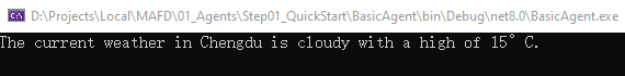 Console.WriteLine(await agent.RunAsync("Tell me the weather like in Chengdu?"));