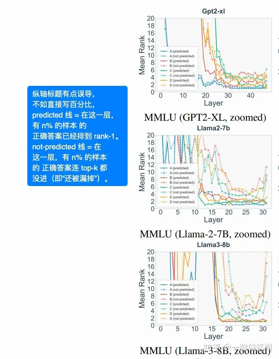 其三、即便到了输出段,输出token的分布仍然在显著变化。 下面这张图比较绕,画得是样本有n%样本的正确答案在Rank-1(下图实线)/有n%的样本,正确答案没进Top-k,这种变化的情况确实也是有些LLM early exit不一定能拿到好结果的部分原因。
