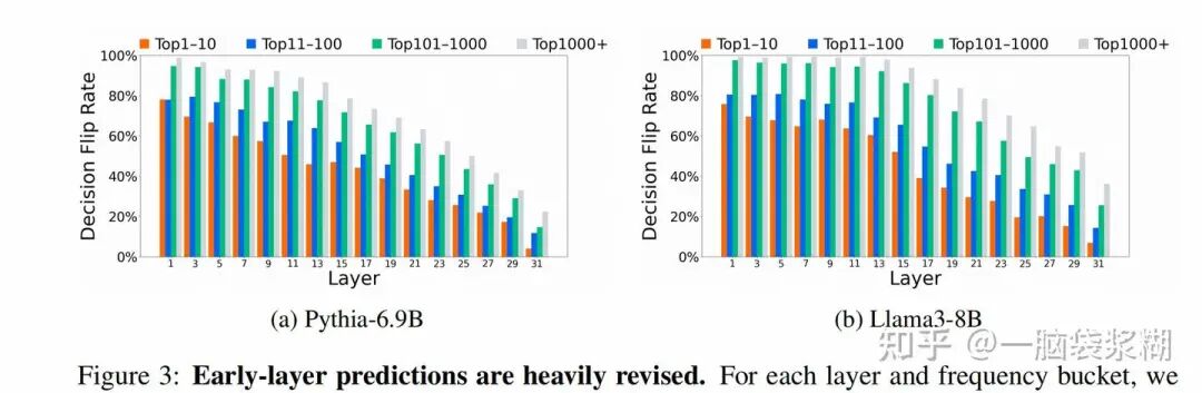 2.怎么用文从TopK排序角度观察,发现即便接近输出的几层LLM的预测仍在显著变化