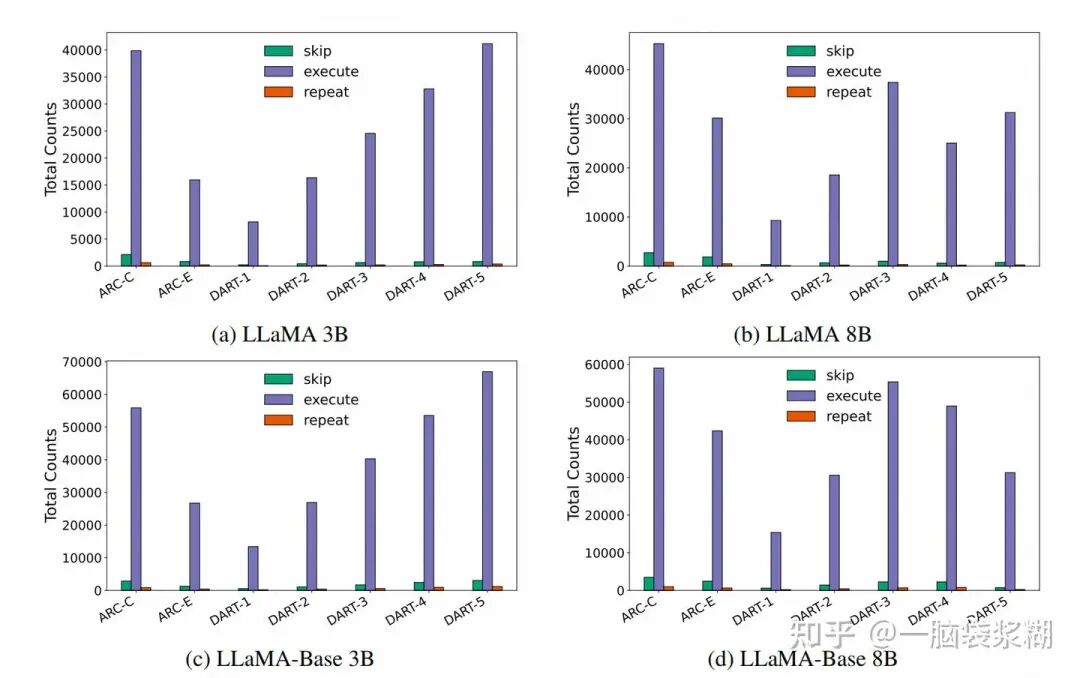 只不过,在<预料之外,情理之中>的是其实MCTS实际采样出来的绝大部分路径还是顺着正常前向走,具体看下图。 下图中作者把多个数据集中用MCTS采样后得到的行动决策数展示了出来,图上几乎难以见到【重播】,在ARC数据集上还能见到一点比例的【跳过】。