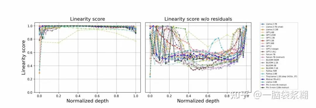 上图确实展示了:不同模型的共同趋势都是【最后几层的相似度非常高】,并且不拘模型大小,也不拘是否Instruct模型,