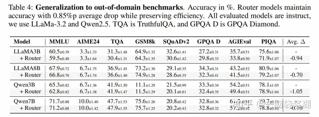 在这个功能的加持下,LLM【并没有】获得更好的结果(In-Domain有涨1%左右,但Out-of-Domain跌1%左右 ,下面+Router就是作者的方法)