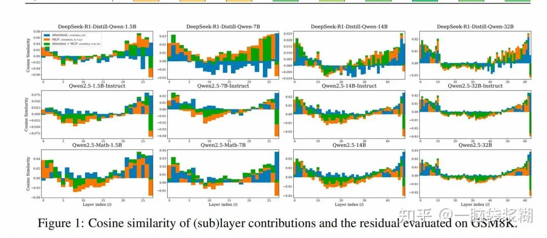 效率文中跟踪观察了,Transformer每个层之间cosine similarity 的变化,并以此作为层使用效率的评价依据。比如下图中,作者把多种模型的每层Attention Output之间,MLP Output之间的cosine similar算出来,形成的这个图。