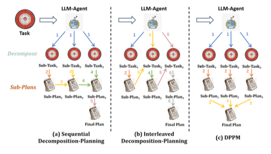 “先分解,后规划” (Decomposition first):这种方法先把大任务彻底分解为所有子任务。其中一个杰出代表是 DPPM (Decompose, Plan in Parallel, and Merge)。它的天才之处在于,在分解任务后,它会并行地(在单独的LLM调用中)为每一个子任务生成子计划。