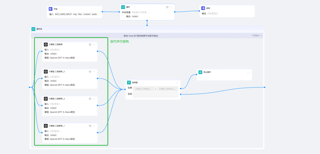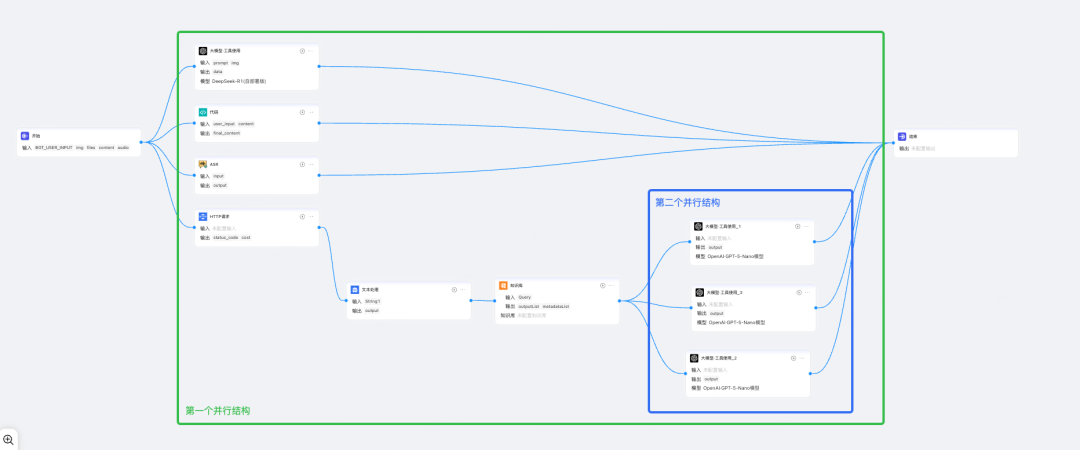 嵌套并行是指 开始->并行结构 -> 并行结构-> … -> 并行结构->结束 多层关系,适用于内部复杂的流程。比如需要先完成请求外部 API,在将响应结果整合后同时交给下游多个节点执行。