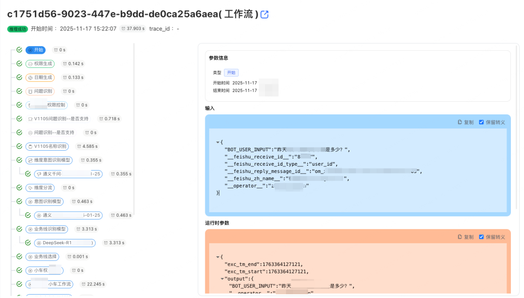 在 AI 应用的开发与使用过程中,请求调用链错综复杂,悟空的观测功能可以追踪并记录环节之间的调用顺序,帮助业务分析推理行为、定位问题或优化性能,实现从 “黑盒模型” 到 “透明决策” 的跨越。