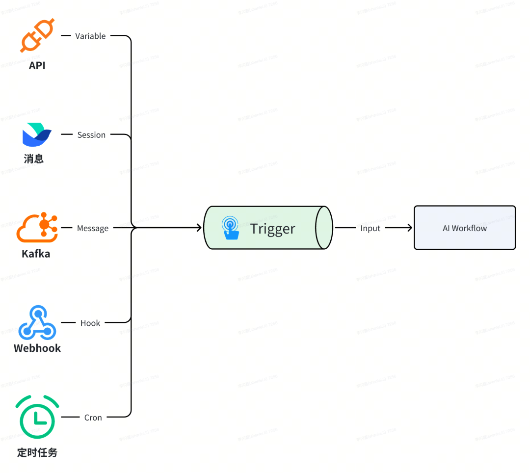 例如,员工通过企业办公软件(飞书)在群组中发送了消息,需要监听消息推送事件,运行 AI Chat 工作流;或是研发提交了一个 Gitlab Merge Request,触发了 Gitlab MR Webhook,运行 AI 代码审查工作流;甚至是推送了一条 Kafka Message,当 Consumer 到 Message 时,运行 AI 工作流。