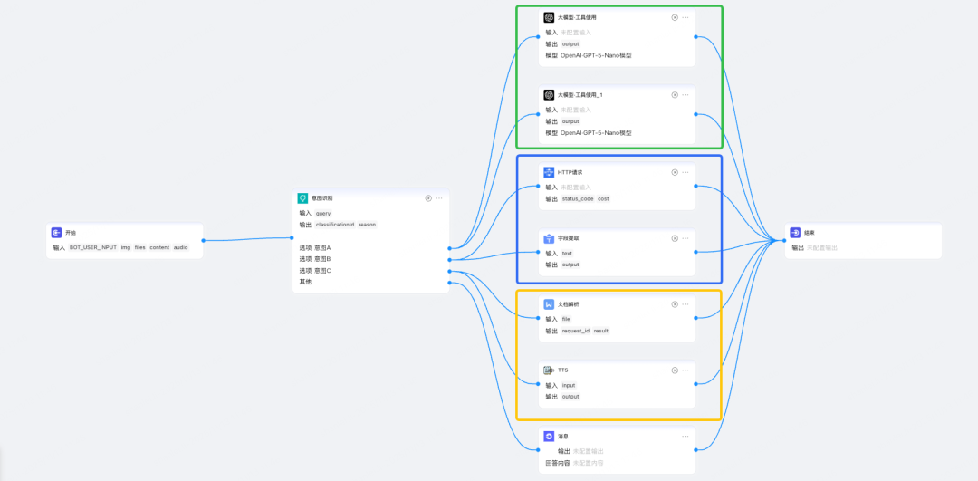 悟空也扩展了意图节点的能力,可根据命中用户意图,运行不同的并行结构,甚至也可以同时命中多个意图选项,同时运行多个意图下的并行结构。