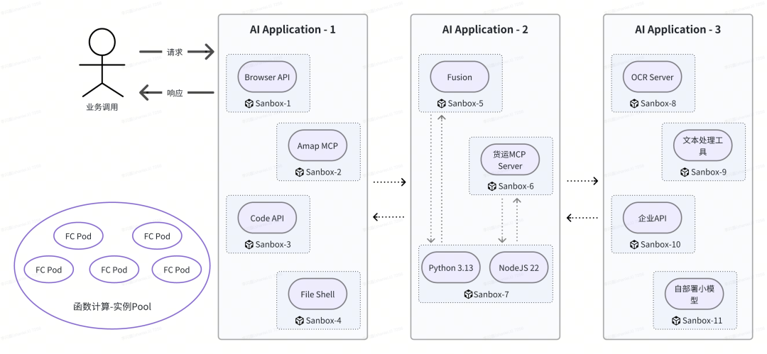 AI 应用推理过程中可能涉及代码执行、API 调用、MCP 使用、文件读写等步骤,而之前的悟空 AI 应用对应 Application Json Schema 配置,本质上运行的是同一套服务代码,这就导致这些步骤被服务环境、运行依赖、语言版本等差异性限制。具体痛点如下: