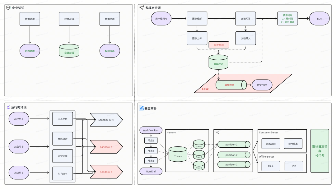 企业 AI 使用,安全是一切的基石。企业 AI 使用中涉及法务约束、算法备案、数据合规、涉敏涉政、文本检测、多模态识别、审计留存等环节,都需要做好安全配套把关和拦截能力。其中 AI 运行时动态的知识、图片、离线文件、代码、环境、依赖、日志等处理环节和数据,尽量不出内网,按需隔离。需要出内网,做好检测和拦截机制。