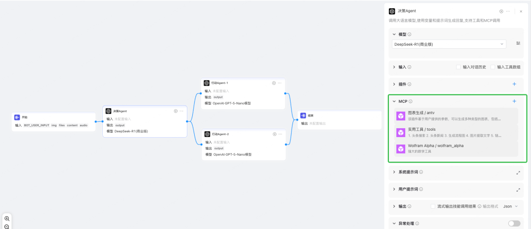 此外,在 AI Workflow 中,大模型也可关联 MCP 使用,将单一的模型升级为基于 ReAct 模式的 Agent,再结合工作流模式,也能达到 Multi Agent 的另类实现: