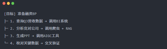 面对复杂目标,Agent 会生成任务计划树,例如: