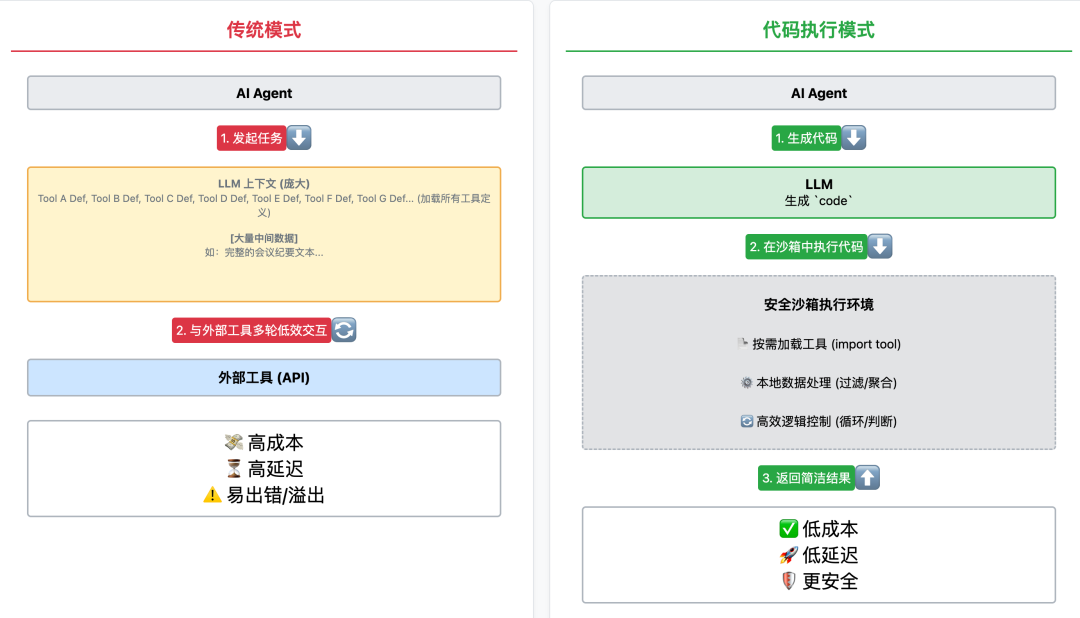 代码执行模式是对现有工具调用机制的一种范式转变。它借鉴了软件工程思想,用于解决 AI Agent 在规模化时遇到的效率和成本问题。