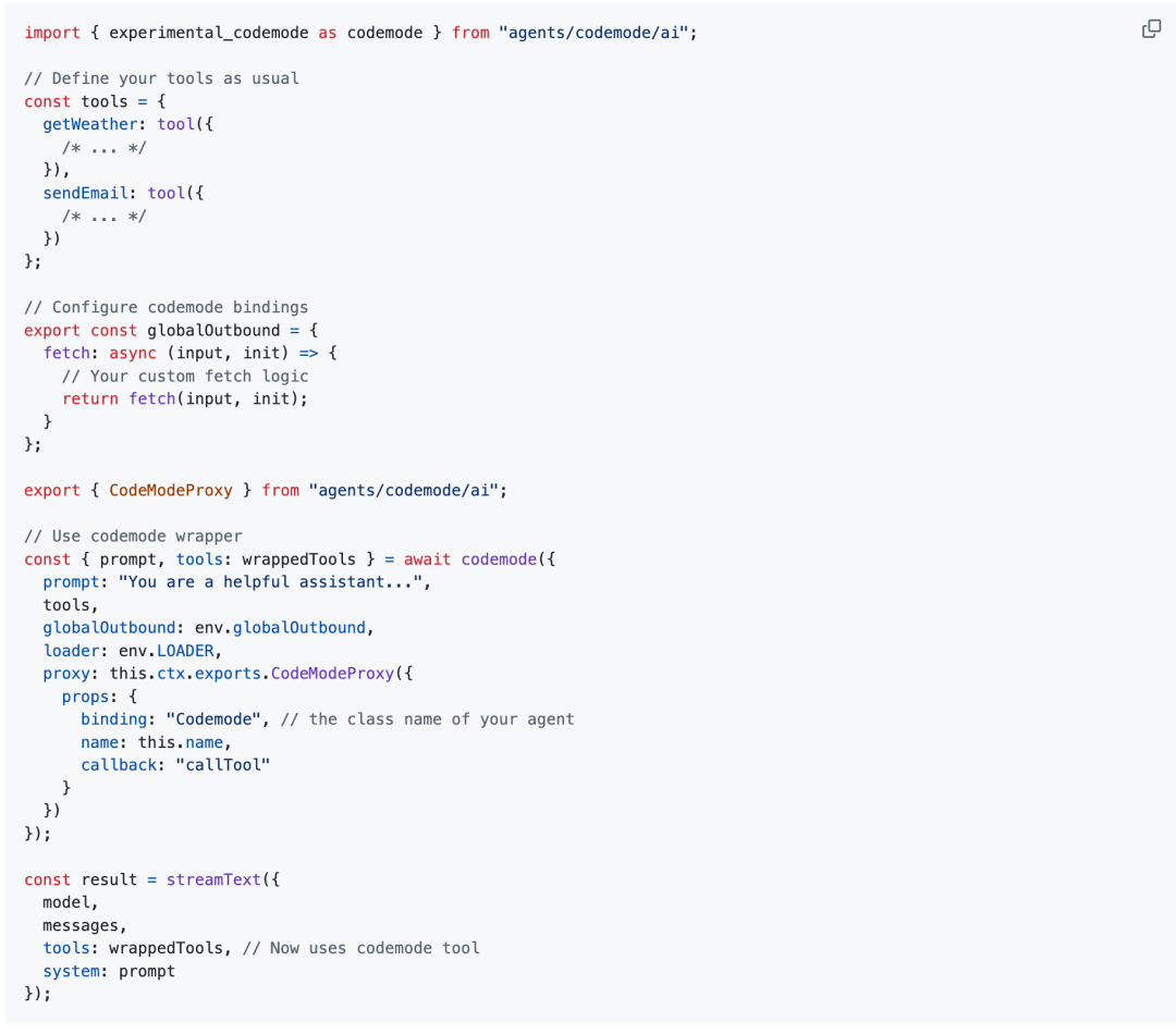这个有源码实现:https://github.com/cloudflare/agents/blob/main/packages/agents/src/codemode/ai.ts