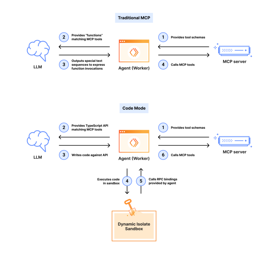 为解决这些问题,Anthropic 和 Cloudflare 等公司提出了一种新的范式——**代码执行模式 (Code Execution Mode)**。