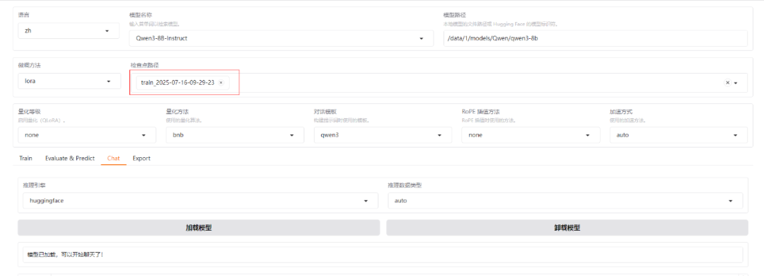 1)切换至Chat,选择之前训练的检查点,点击加载模型