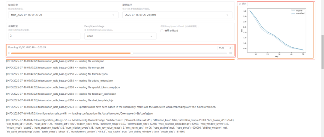 6)模型训练启动成功后,可查看模型训练进度以及损失函数降低情况: