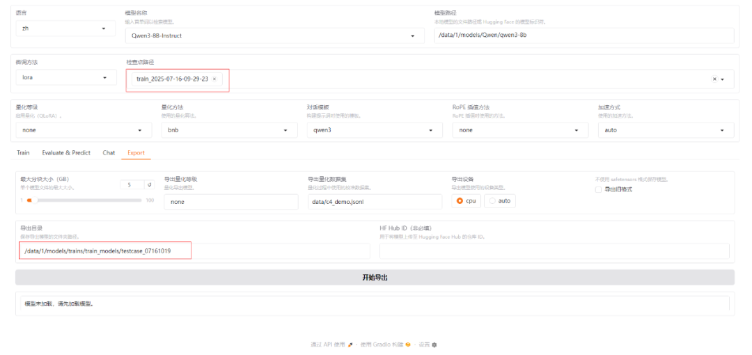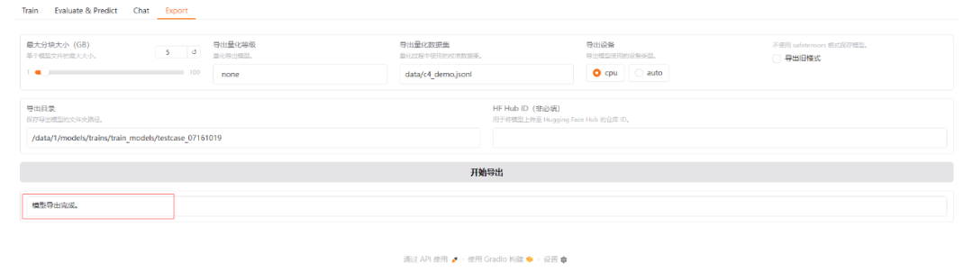 2)输入导出目录,点击开始导出,此时llama-factory将合并基础模型与微调检查点内容,并输出完整模型。