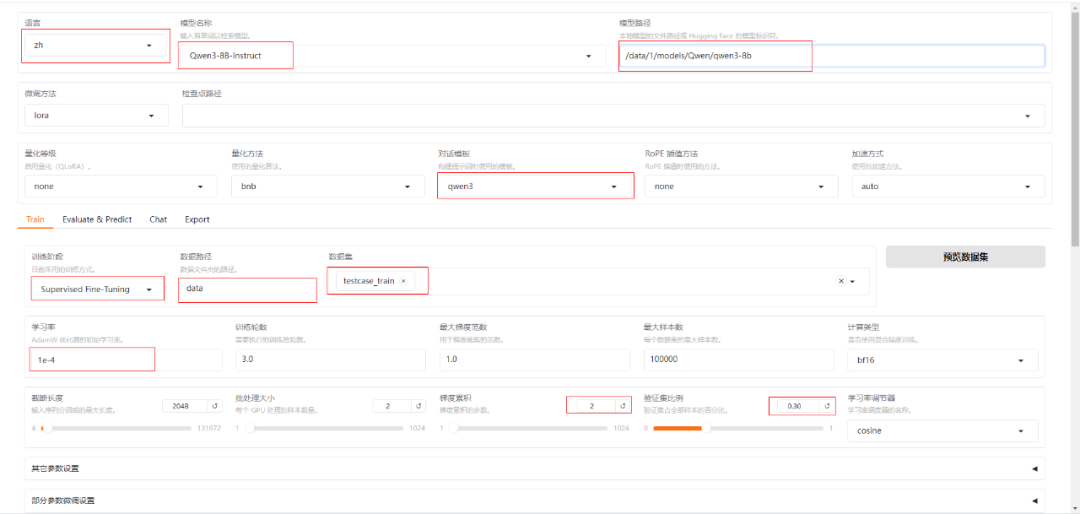 1) 对页面内容进行配置如下(这里选择本地模型作为基础模型,并选择testcase_train作为训练数据集):