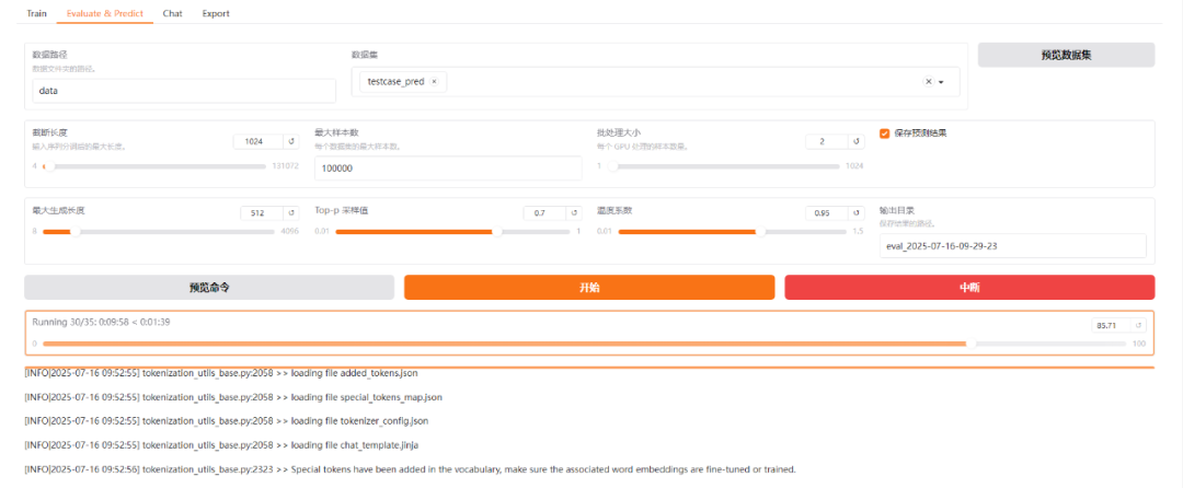1)切换到Evaluate&Predict页面,选择之前准备的评估数据集,启动模型评估过程