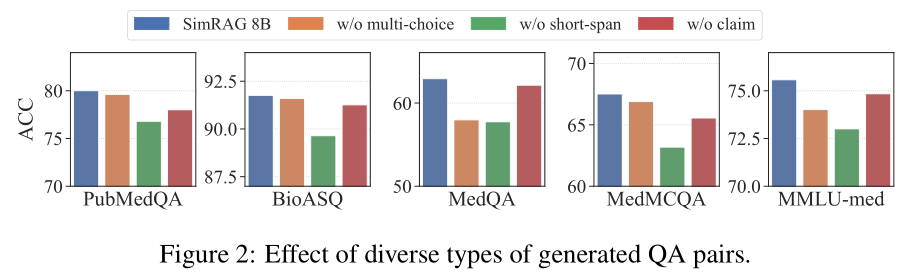 多样化问题的优势:仅生成单一类型QA对的模型,在跨任务泛化能力上比SimRAG低3.5%,说明多样化问题能帮助模型适应不同场景。