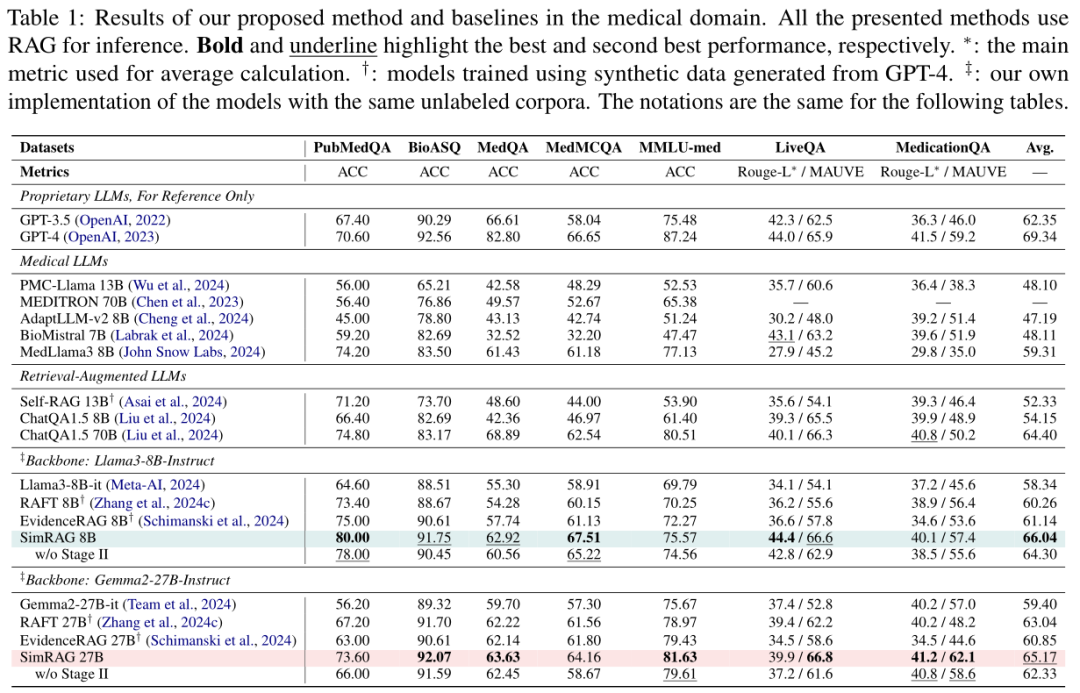 MedLlama、SciTulu等专业模型虽在领域数据上微调,但未针对“检索增强”优化——它们难以有效利用检索到的专业文档,常出现“凭记忆答题”而非“依文档答题”的情况。例如在PubMedQA任务中,MedLlama的准确率为78.2%,而SimRAG达到85.6%,差距主要源于“是否能利用检索到的医学文献修正记忆偏差”。